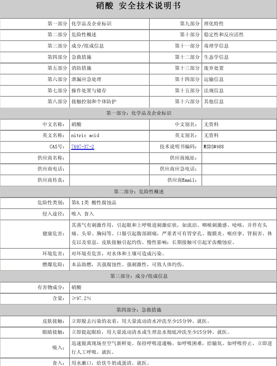 硝酸又稱硝鏹水、鏹水、氨氮水、稀硝酸、濃硝酸、發(fā)煙硝酸。是一種強(qiáng)氧化性、腐蝕性的強(qiáng)酸。硝酸易溶于水,常溫下其溶液無色透明。其不同濃度水溶液性質(zhì)有別,市售濃硝酸為恒沸混合物,質(zhì)量分?jǐn)?shù)為69.2%(約16mol/L),質(zhì)量分?jǐn)?shù)足夠大(市售濃度為95%以上)的,稱為發(fā)煙硝酸。硝酸易見光分解,應(yīng)在棕色瓶中于陰暗處避光保存,嚴(yán)禁與還原劑接觸